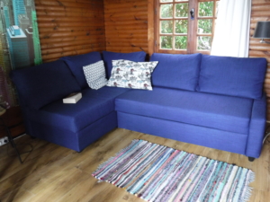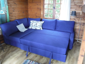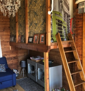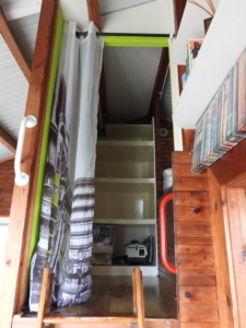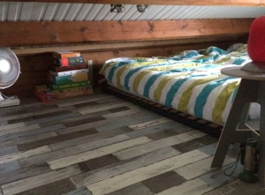 Slaapkamer: de slaapzolder bereik je via een open trapje met 5 treden en een kleine overloop. Vanaf de overloop dien je de slaapzolder in te kruipen. Er liggen daar 3 comfortabele matrassen. Dekbedden en kussens aanwezig Op de slaapzolder is geen stahoogte. Men kan ook kiezen voor de comfortabele slaapbank op de begane grond.