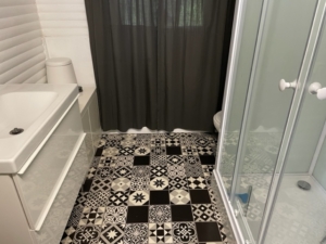 Badkamer: douchecabine; toilet en wastafel. Vakkenkast voor toilettassen, handdoeken etc.